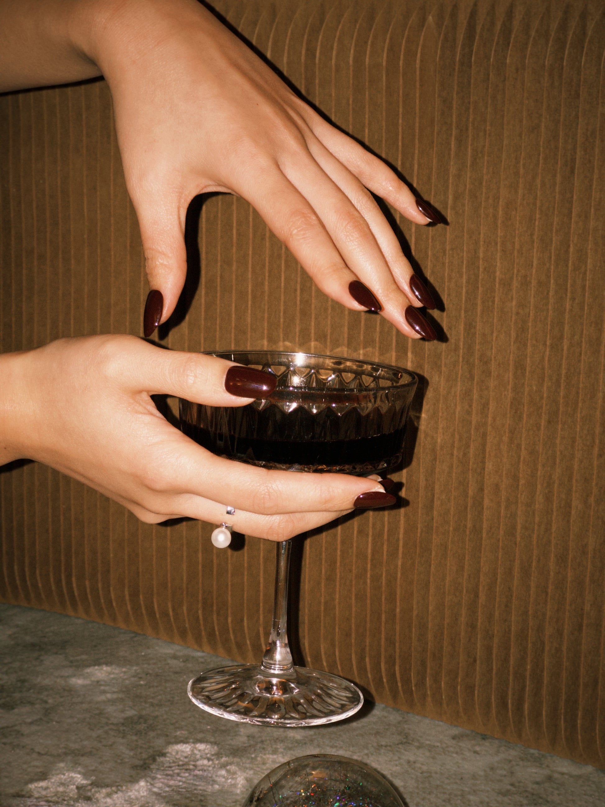 Deep, delicious burgundy red nails inspired by a cozy mug of mulled wine, warming your fingertips like a holiday hug by the fire.